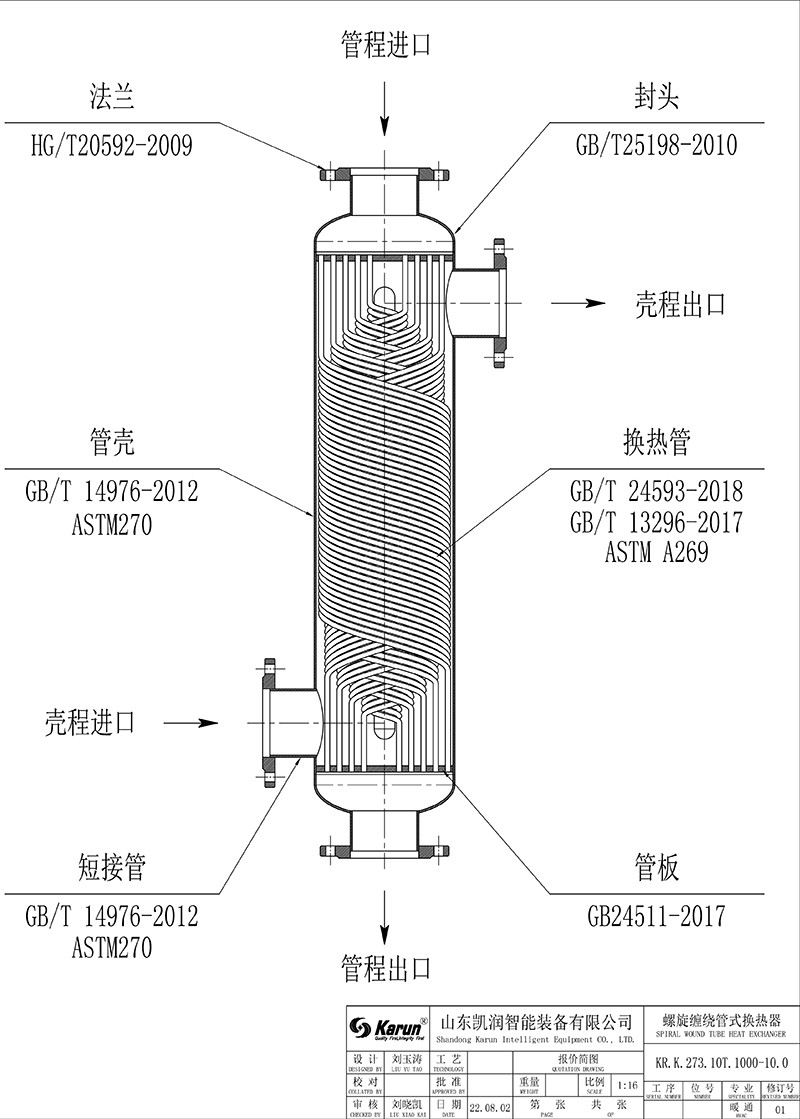 2.非對稱流設計:螺旋纏繞管式換熱器管程與殼程容積不相同,殼程容積能達到管程容積的 4.2 倍,以滿足醫(yī)藥,化工等各種不同復雜工況要求。